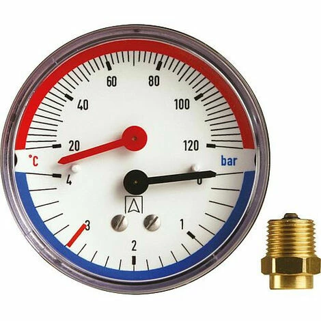 Pour mesure combinée de pression et de température dans les installations de chauffage et de chaudières. Plage d’affichage : 20°C 120°C Classe thermomètre : 2,0 Classe manomètre : 2,5